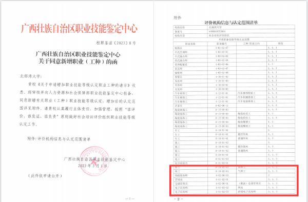 近日,我校职业技能鉴定所在职业技能等级认定范围获得新突破,经过积极申报喜获广西壮族自治区职业技能鉴定中心批复(桂职鉴函[2023]8号),同意新增12个职业(17个工种)的职业技能等级认定资质,可满足经济管理学院、资源与环境学院、石油与化工学院等多个学院的职业技能认定需求。