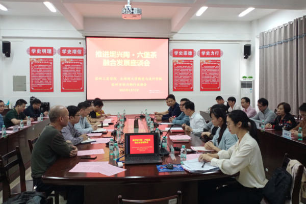 4月12日下午,坭兴陶六堡茶融合发展座谈会在陶瓷与设计学院301会议室召开。钦州市总工会党组书记丁起文、副主席杨玉红、劳动经济和权益保障部部长蒋玉梅、陶瓷与设计学院领导班子、钦州市坭兴陶行业协会领导、坭兴陶工匠劳模、坭兴陶和六堡茶相关企业负责人等30多人参加了座谈会。座谈会由创新创业学院常务副院长、钦州工匠学院副院长吴炳俊主持。