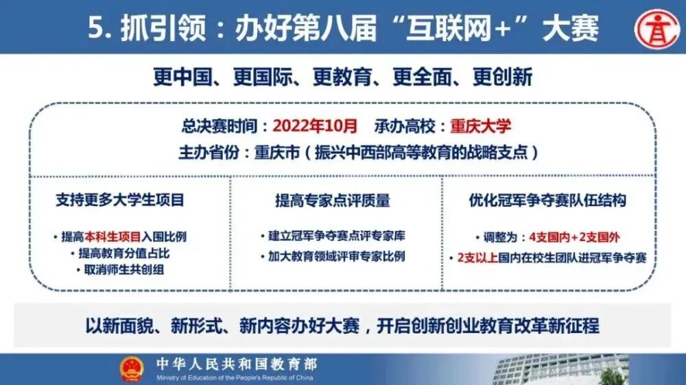 近日,教育部高教司司长吴岩在2022全国高教处长会议上提出了办好第八届“互联网+”创业大赛,并介绍了第八届国际“互联网+”大赛政策的调整方向: